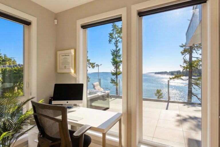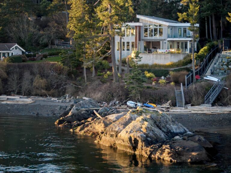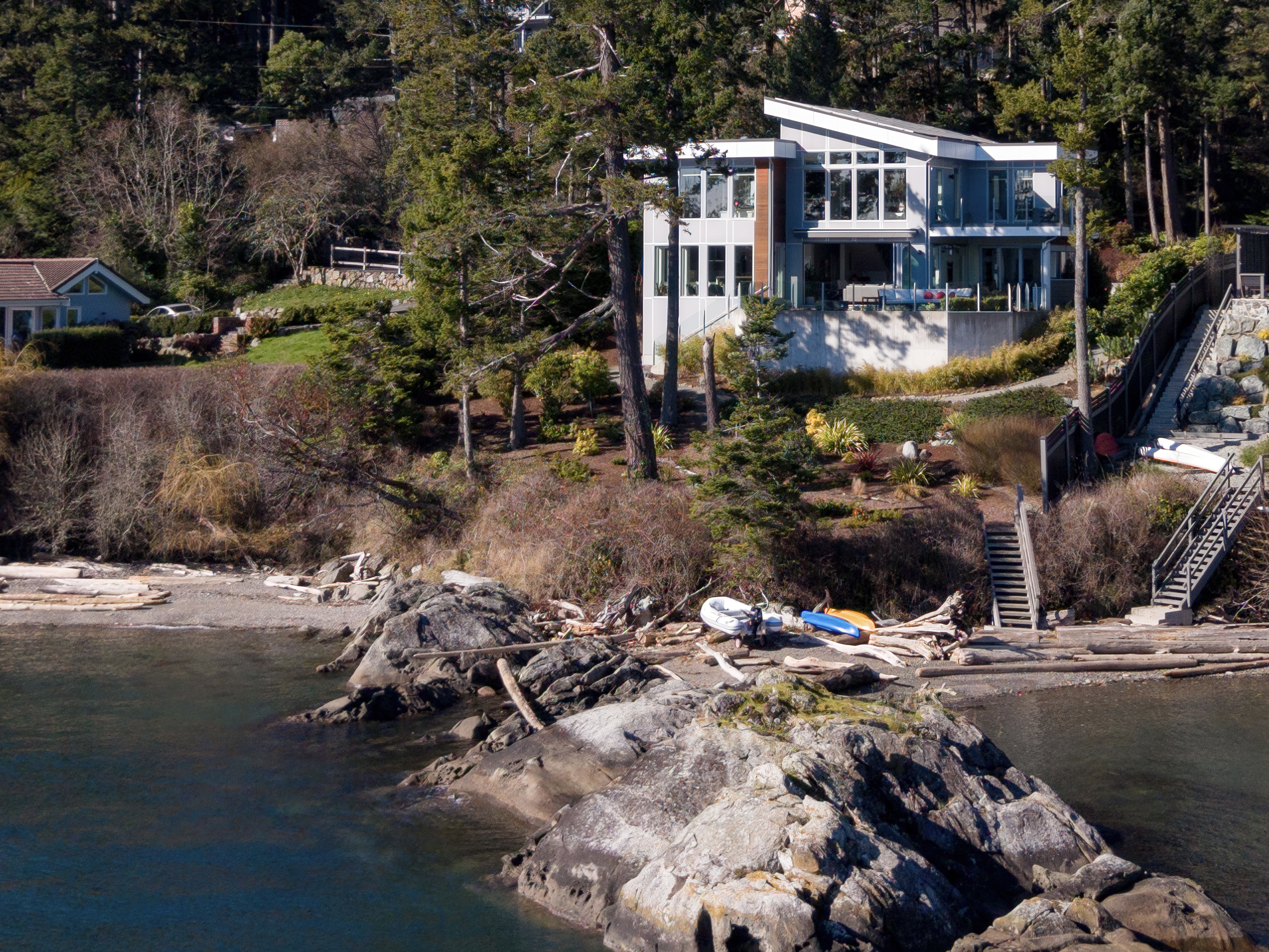 South-facing oceanfront living with exceptional, unobstructed 180° views and outstanding sun exposure from sunrise to sunset. Privately set behind a gated entrance on a beautifully landscaped, low-maintenance half-acre lot, this home offers "over 1,050 sq.ft of ocean facing decks for seamless indoor-outdoor living. Enjoy easy beach access directly in front—perfect for launching a kayak or paddleboard—then unwind in the premium saltwater hot tub. Oversized windows fill the open-concept interior with natural light and showcase captivating views from nearly every room. The flexible layout offers 3 bedrooms plus an office or 4 bedrooms. A designer kitchen with high-end appliances anchors the space, complemented by hardwood floors, outdoor kitchen, infrared heaters and integrated sound system. Solar panels provide impressive energy savings. Double garage with Level 2 charger, ample storage and a quiet setting minutes to Sidney.
